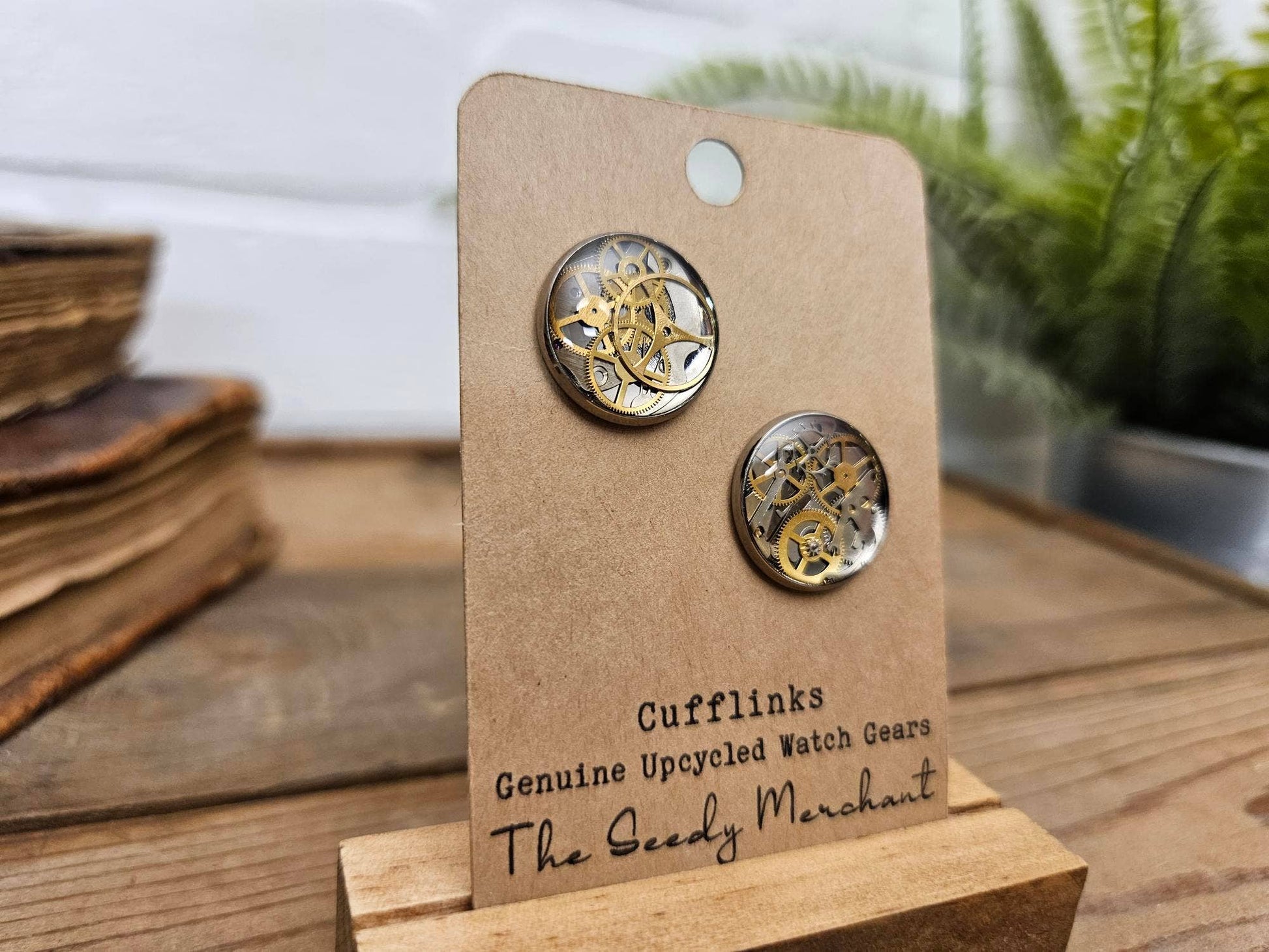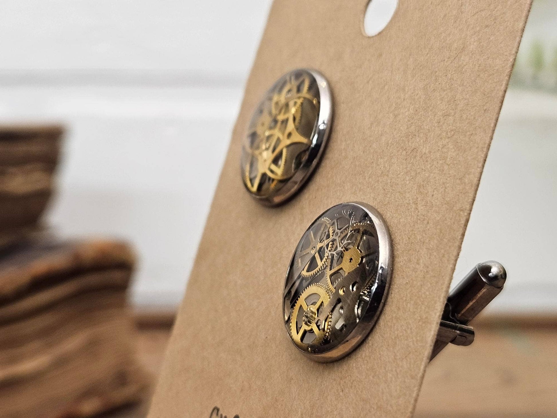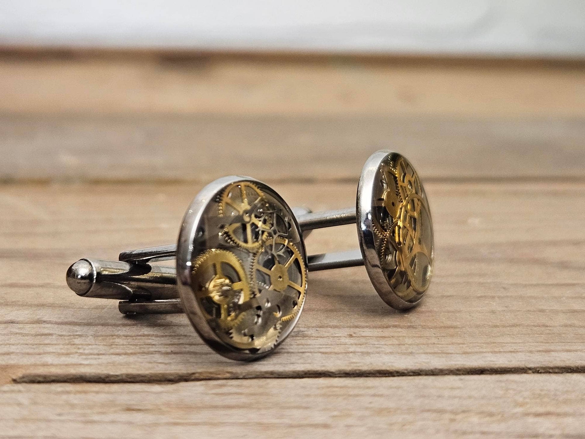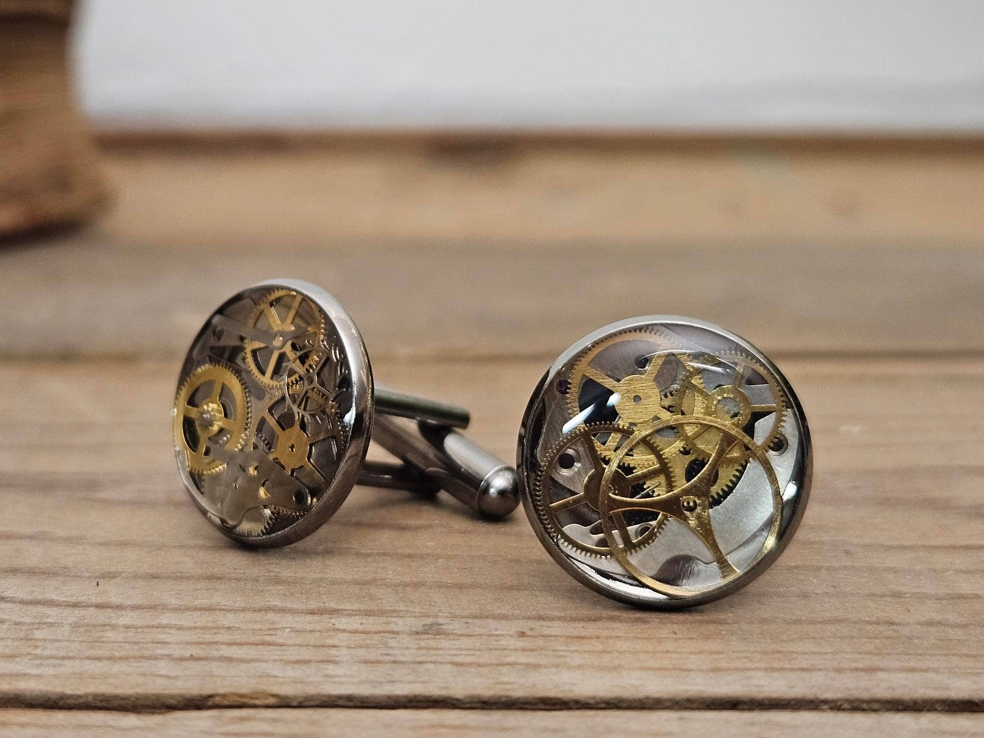 **The cufflinks received may vary slightly from the photo, but they are all made the exact same way with approximately the same number of gears and materials** These are a set of 2 handmade and one-of-a-kind Steampunk-style cufflinks with a gunmetal-colored finish. They feature upcycled reclaimed authentic watch parts set in a crystal-clear hard resin. Simple yet effective and add a unique aspect to your attire. Approximately 0.7" (18mm) in diameter and the post is approximately 1/2" (12mm) in length. Comes on a 2" x 3" display card with a 1/4" hole for hanging.
