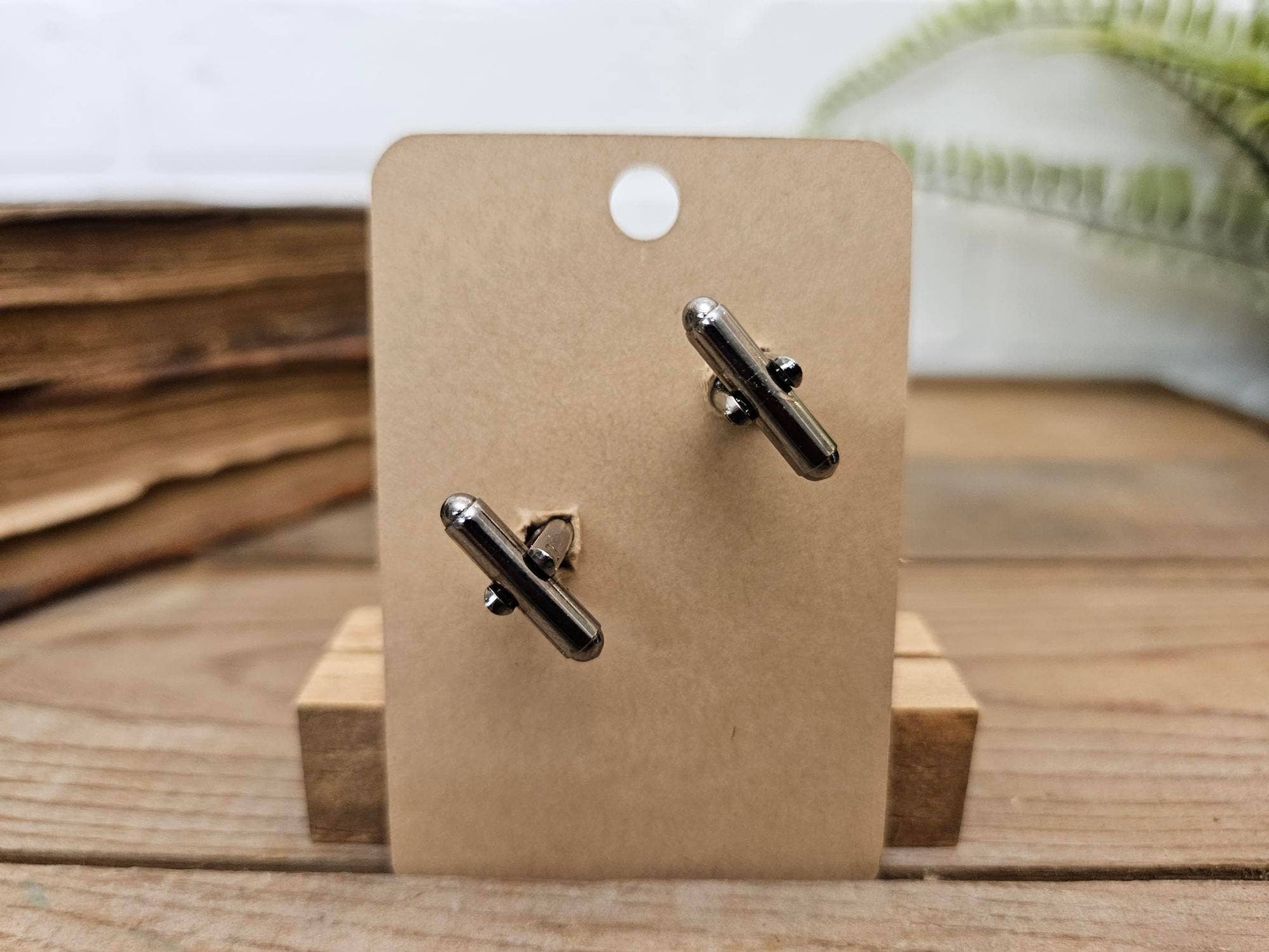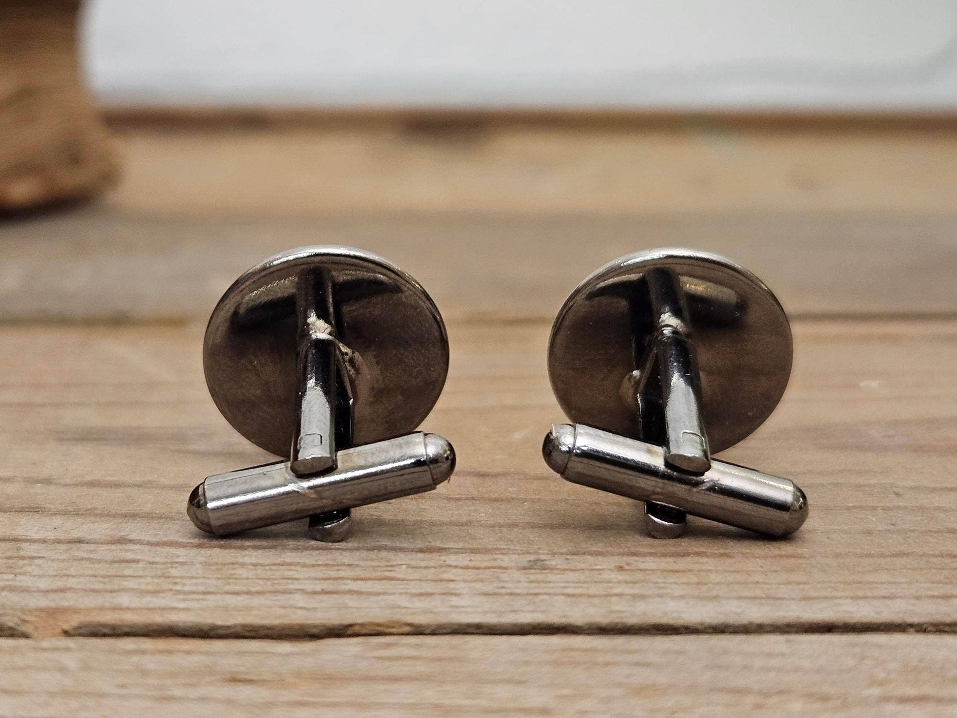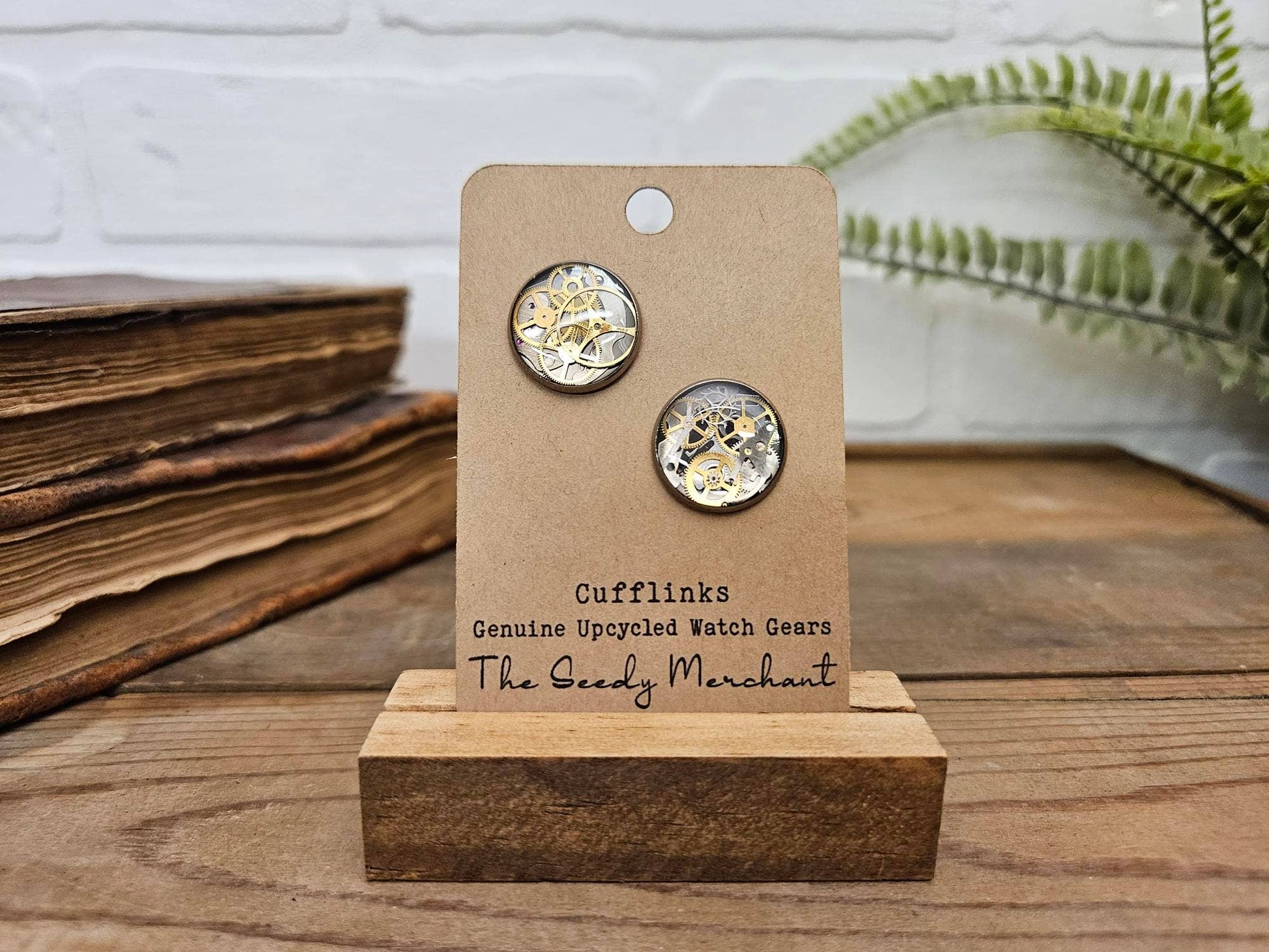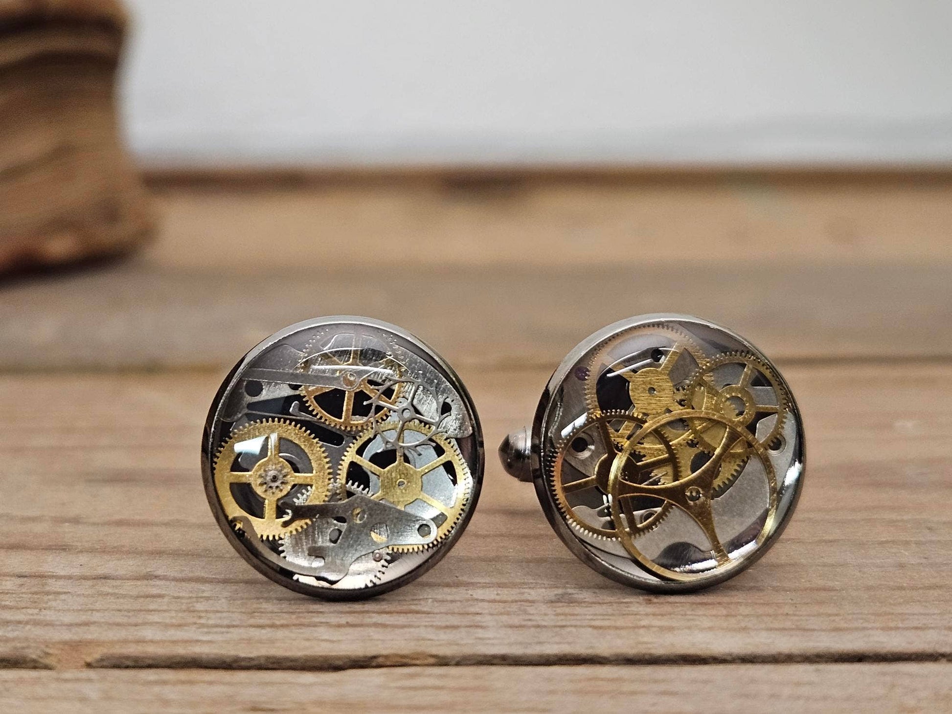 **The cufflinks received may vary slightly from the photo, but they are all made the exact same way with approximately the same number of gears and materials** These are a set of 2 handmade and one-of-a-kind Steampunk-style cufflinks with a gunmetal-colored finish. They feature upcycled reclaimed authentic watch parts set in a crystal-clear hard resin. Simple yet effective and add a unique aspect to your attire. Approximately 0.7" (18mm) in diameter and the post is approximately 1/2" (12mm) in length. Comes on a 2" x 3" display card with a 1/4" hole for hanging.
